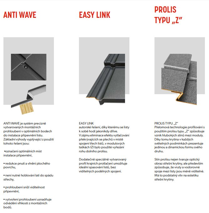 Autorské řešení, díky kterému se listy k sobě hodí jakonikdy dříve.V zájmu eliminace efektu vytlačování překrývajících se plechů v místě spojení třech listů, v modulových taškách IZI bylo použité vyřezání rohu dolního prolisu. Dodatečně speciálně vytvarovaný profil krajních protlačení umožňuje ideální spasování listů, bez viditelných podélných spojení.